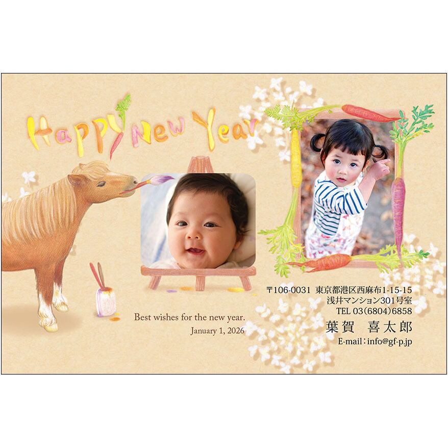 2026午年用の年賀状デザインです。インクジェットプリンターなどで、はがきに印刷してお使いください。