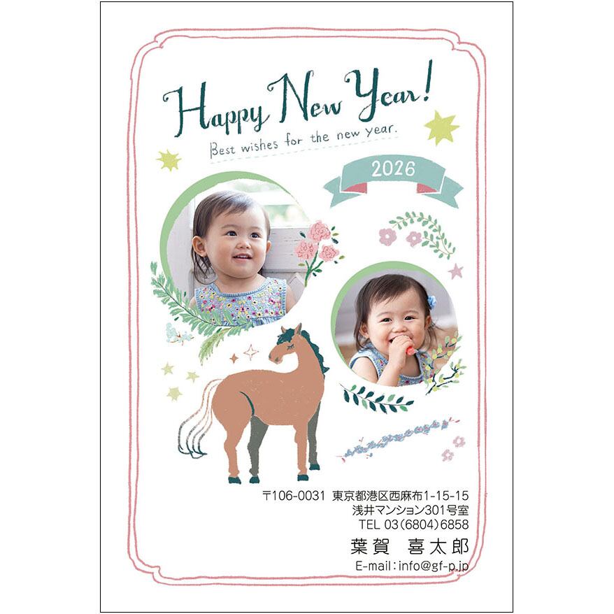 2026午年用の年賀状デザインです。インクジェットプリンターなどで、はがきに印刷してお使いください。