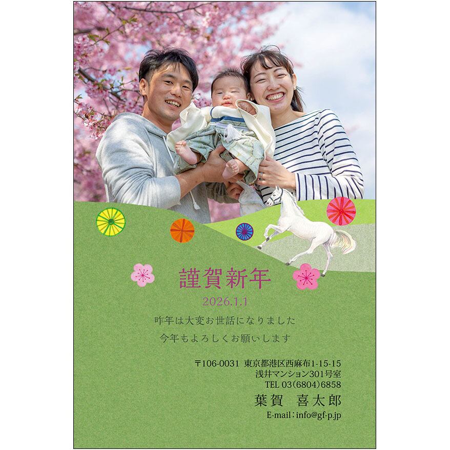 2026午年用の年賀状デザインです。インクジェットプリンターなどで、はがきに印刷してお使いください。