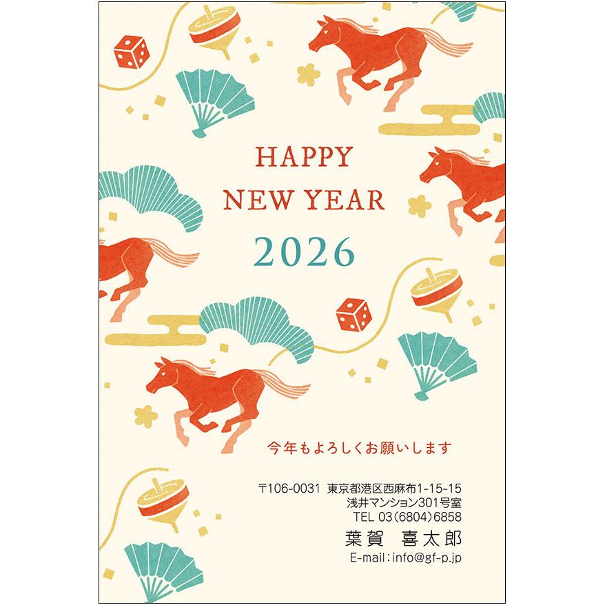 2026午年用の年賀状デザインです。インクジェットプリンターなどで、はがきに印刷してお使いください。