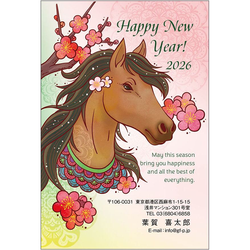 2026午年用の年賀状デザインです。インクジェットプリンターなどで、はがきに印刷してお使いください。