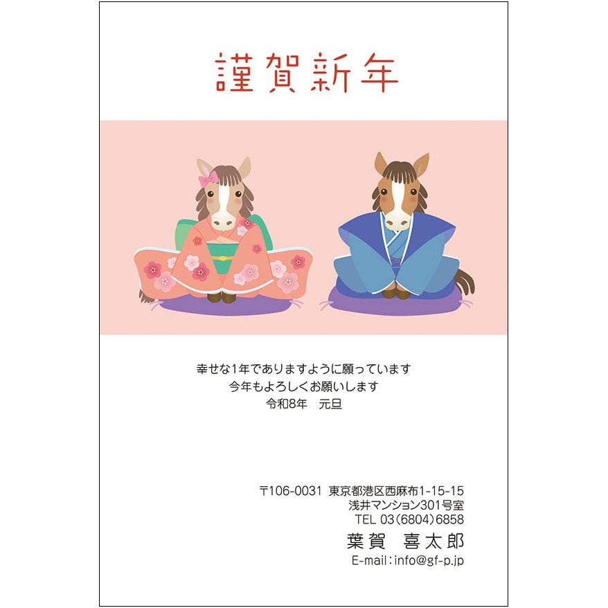 2026午年用の年賀状デザインです。インクジェットプリンターなどで、はがきに印刷してお使いください。