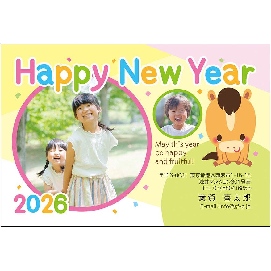 2026午年用の年賀状デザインです。インクジェットプリンターなどで、はがきに印刷してお使いください。