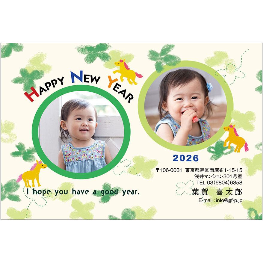 2026午年用の年賀状デザインです。インクジェットプリンターなどで、はがきに印刷してお使いください。