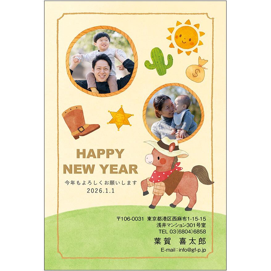 2026午年用の年賀状デザインです。インクジェットプリンターなどで、はがきに印刷してお使いください。