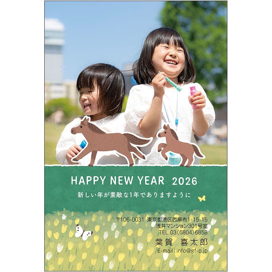 2026午年用の年賀状デザインです。インクジェットプリンターなどで、はがきに印刷してお使いください。