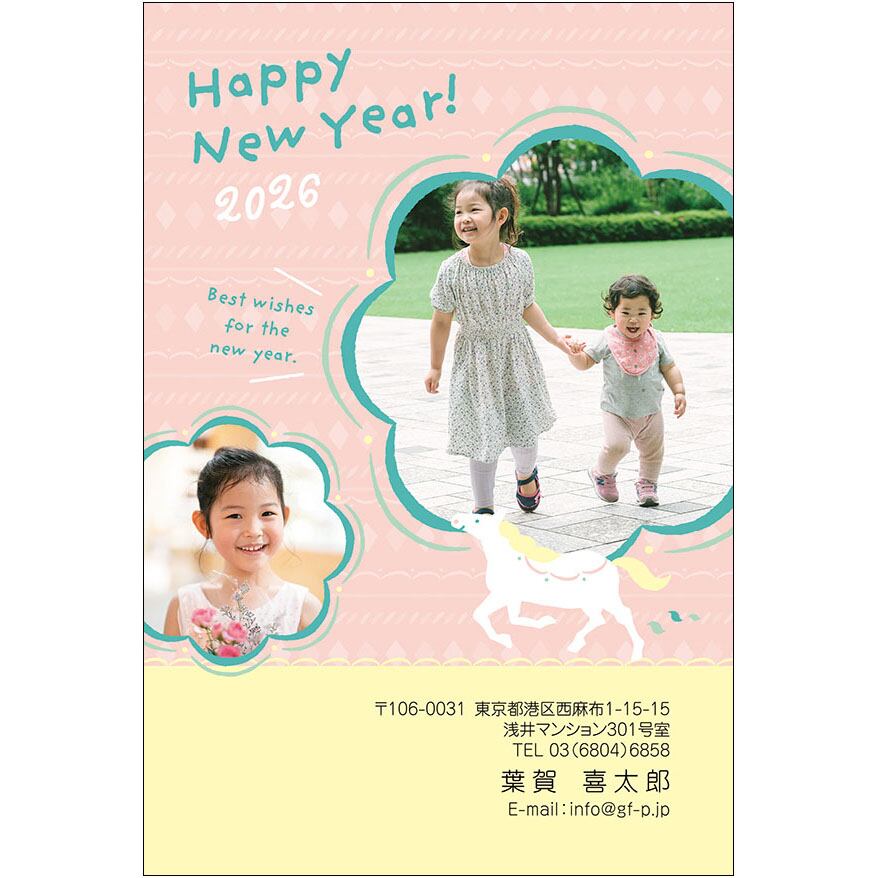 2026午年用の年賀状デザインです。インクジェットプリンターなどで、はがきに印刷してお使いください。