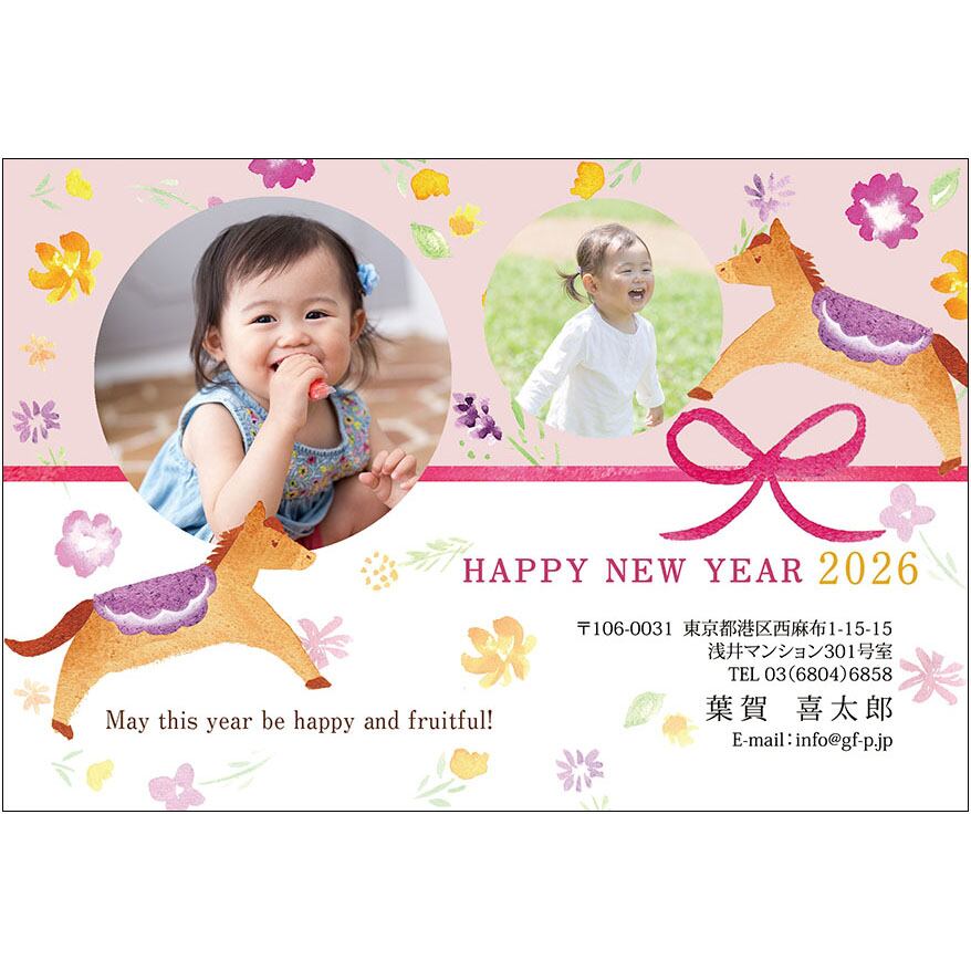 2026午年用の年賀状デザインです。インクジェットプリンターなどで、はがきに印刷してお使いください。