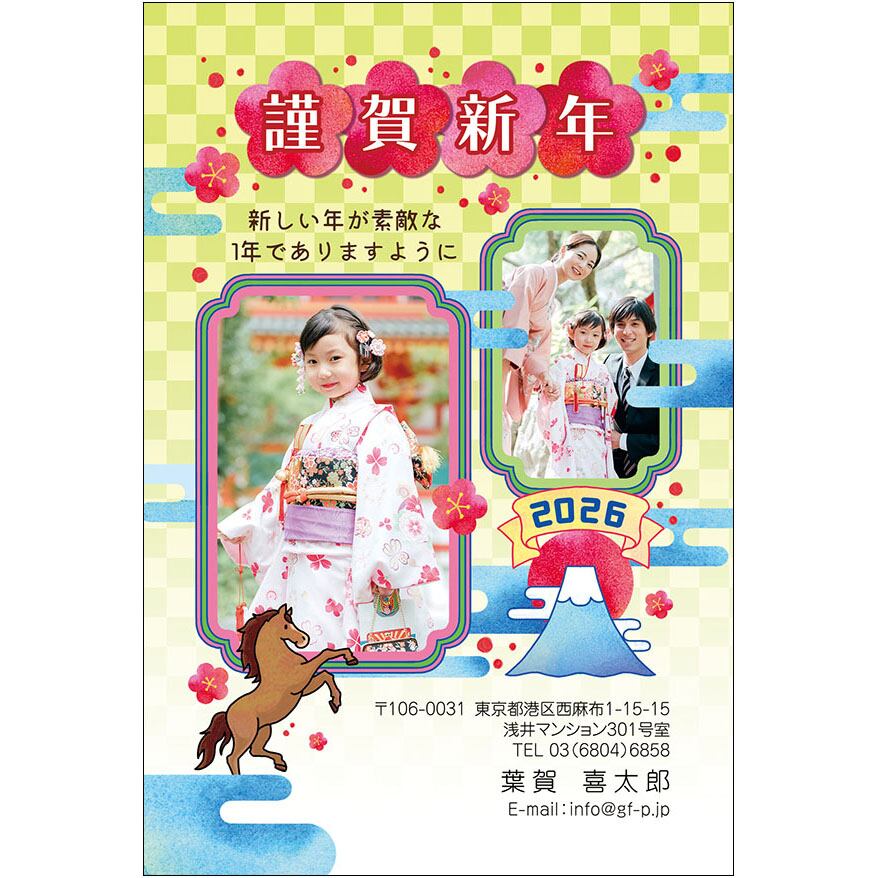 2026午年用の年賀状デザインです。インクジェットプリンターなどで、はがきに印刷してお使いください。
